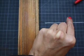Derrière le cadre, on regarde comment disposer son fil de fer, on fait des petits points au feutre à l'aide d'une règle pour que cela soit droit (idée de maman, sinon je me jetais à l'eau sans avoir la certitude que mon fil serait droit...) :